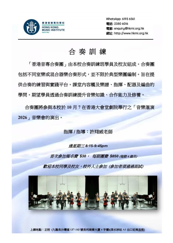 合奏團將參與本校於2026 年 10 月 7日 在香港大會堂劇院舉行之「音樂滙演 2026」音樂會的演出。