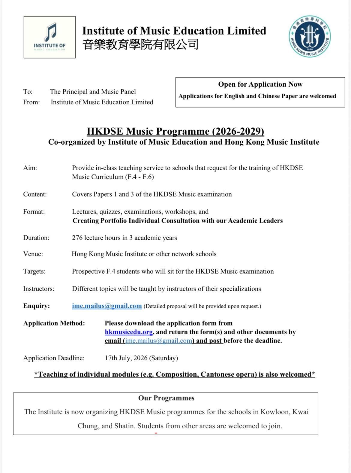 Centre Programme for HKDSE Music Curriculum (2026-2029)