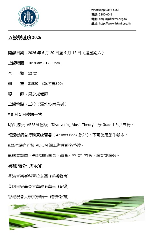 i. 採用教材ABRSM出版‘Discovering Music Theory’分Grade1-5,共五冊。報讀者須自行購買練習書(Answer Book除外)。不可使用影印紙本。