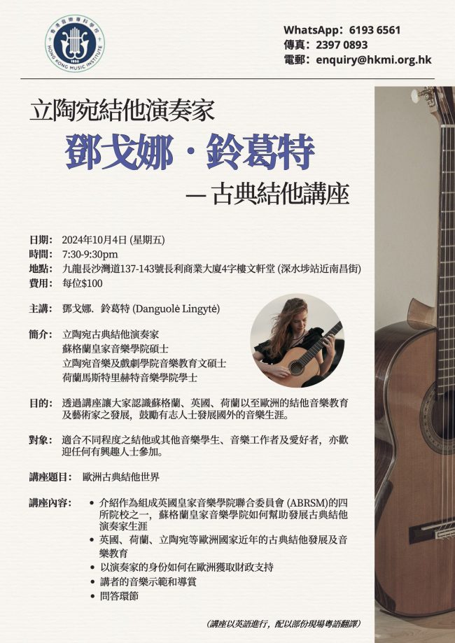 2024年10月講座 – 古典結他講座: 歐洲古典結他世界 最新消息, 短期課程By Rain2024 年 9 月 6 日2024年10月講座 – 古典結他講座: 歐洲古典結他世界 目的:透過講座讓⼤家認識蘇格蘭、英國、荷蘭以⾄歐洲…