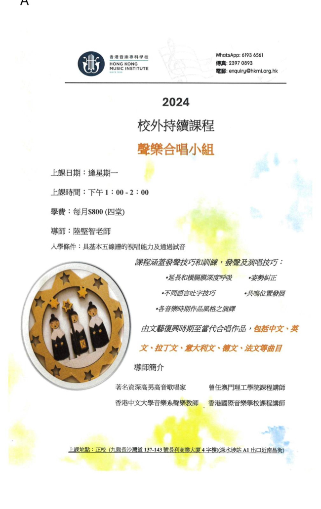 2024年校外持續課程 – 聲樂合唱小組 最新消息, 短期課程, 課程By Rain2024 年 10 月 26 日2024年校外持續課程 – 聲樂合唱小組課程【課程包括】課程涵蓋發聲技巧和訓練,發聲及演唱技巧: ▪️延長和橫…