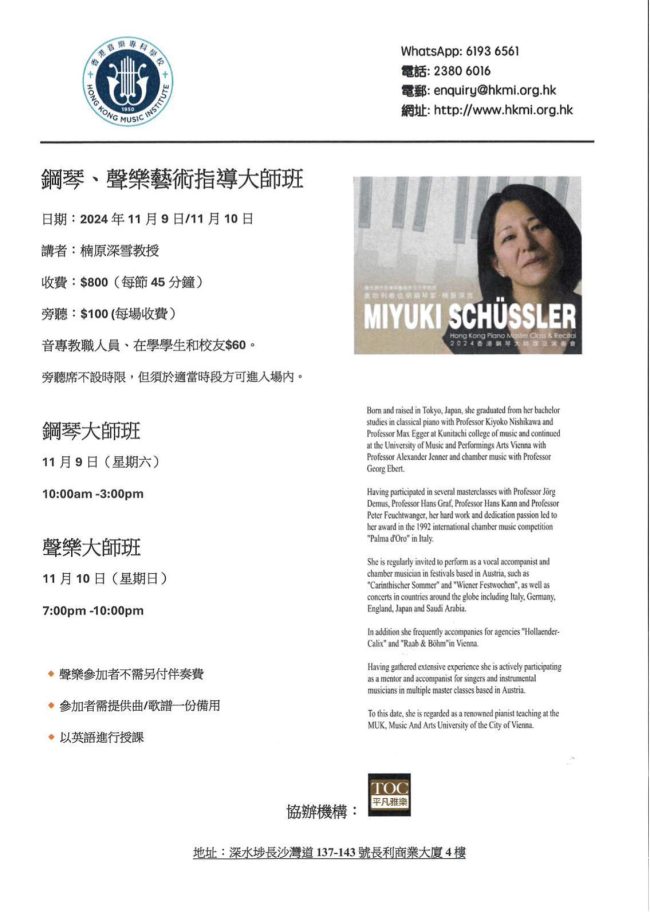 2024年11月大師班 – 鋼琴、聲樂藝術指導大師班 最新消息, 短期課程By Rain2024 年 10 月 26 日2024年11月大師班 – 鋼琴、聲樂藝術指導大師班 講者: 楠原深雪教授(Miyuki Schüssler)…