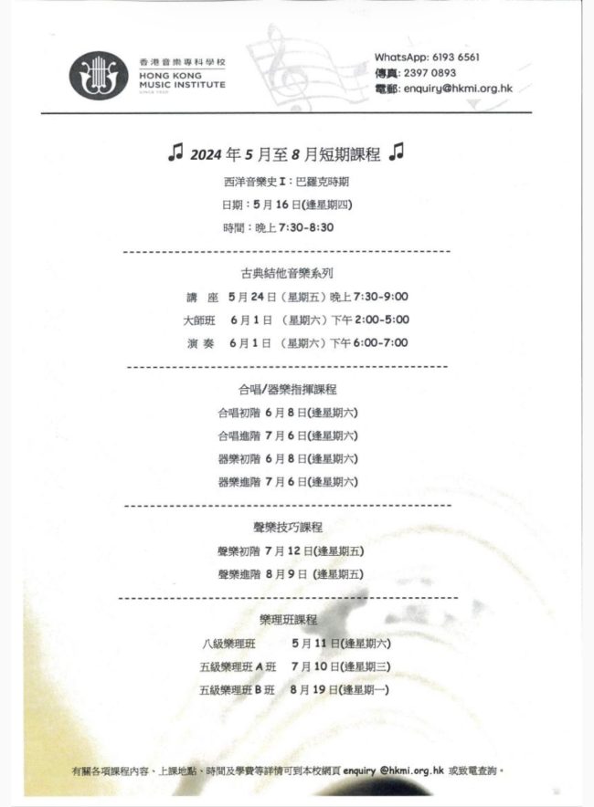 2024年5月短期課程 – 八級樂理班 最新消息, 短期課程, 課程By Rain2024 年 3 月 4 日2024年5月短期課程 – 八級樂理現正接受報名!!◎ 八級樂理班(網上報名之課程名稱:八級樂理2024051…