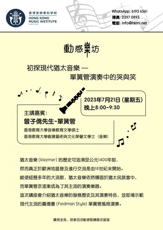 2023年7月講座: 初探現代猶太音樂一 單簧管演奏中的哭與笑免費公開講座 – 現正接受報名!!◎ 講座: 初…