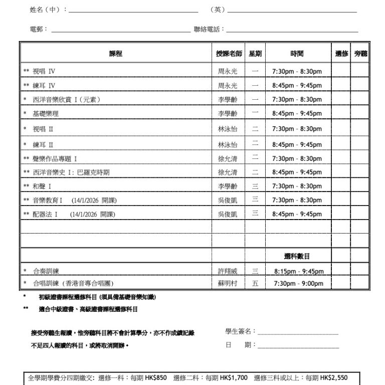 文憑/證書課程、聲樂證書課程及鋼琴教學證書課程招生簡章